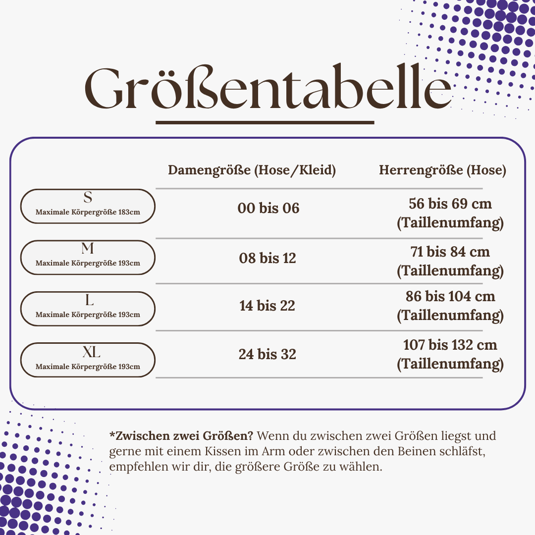 Sieh dir unseren Größenguide an. Wenn du zwischen zwei Größen liegst oder gerne mit einem Kissen im Arm schläfst, empfehlen wir dir, die größere Größe zu wählen.